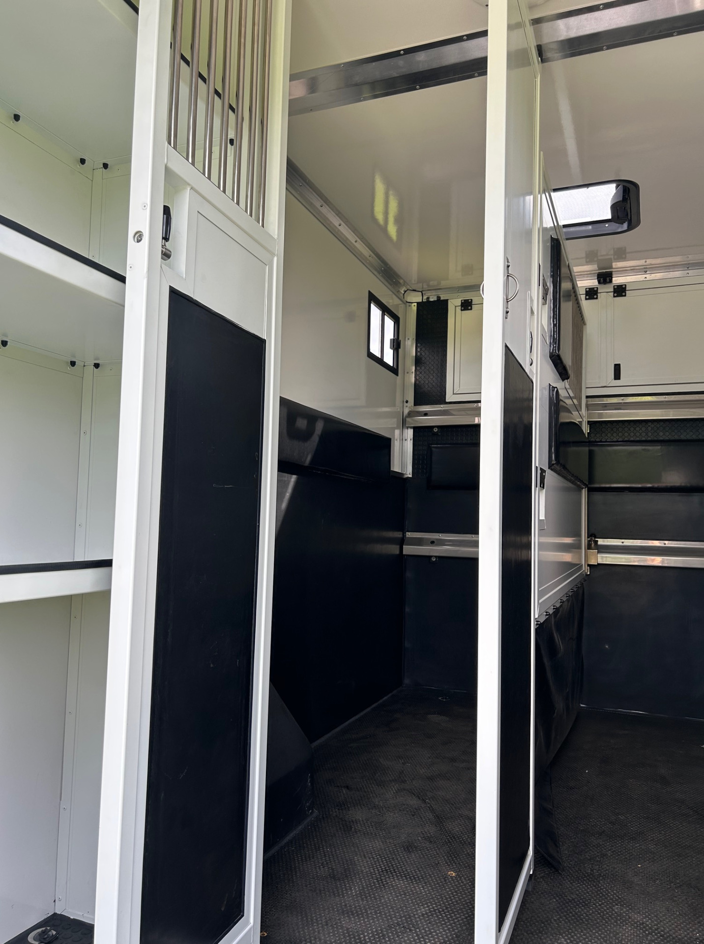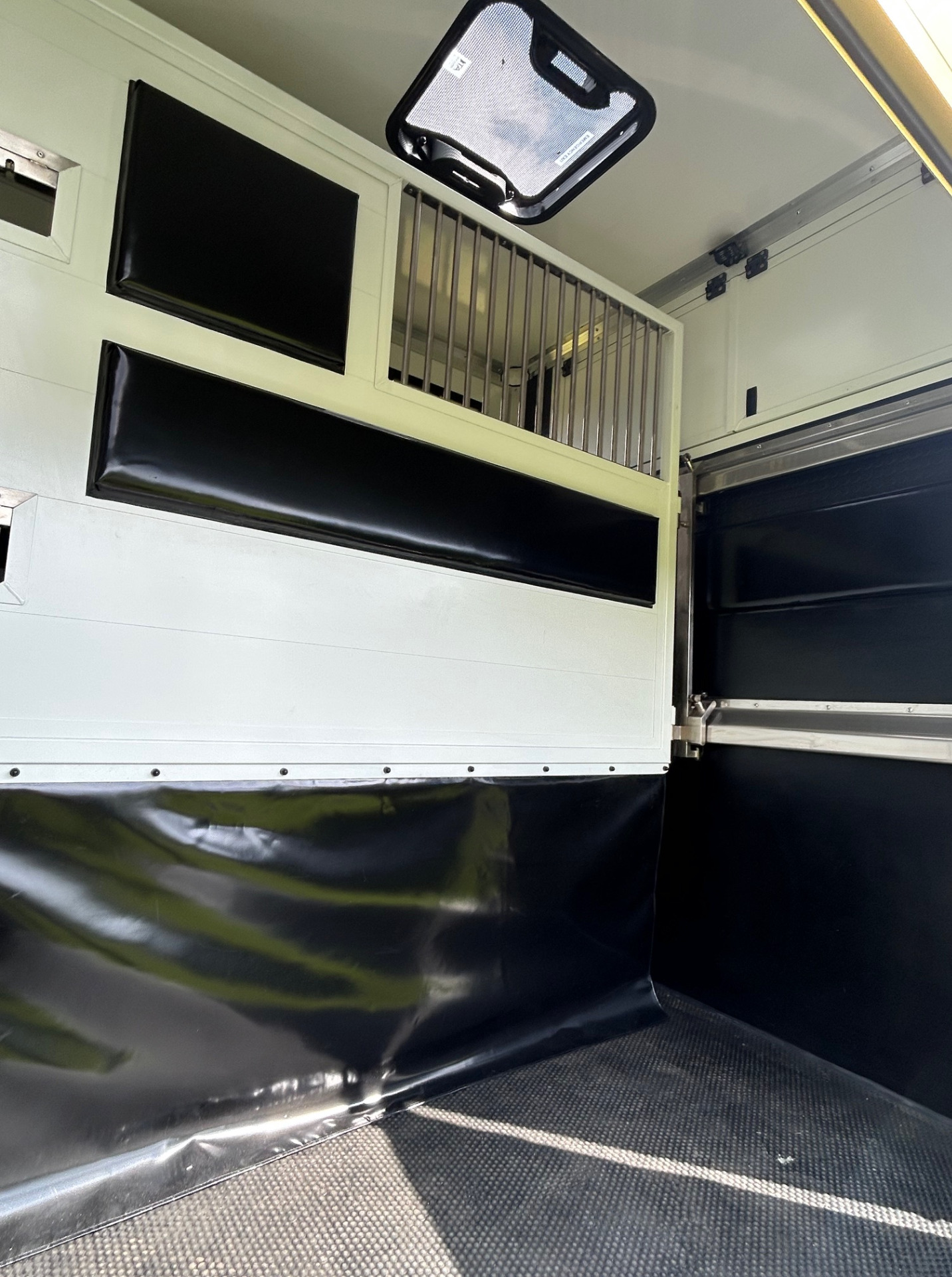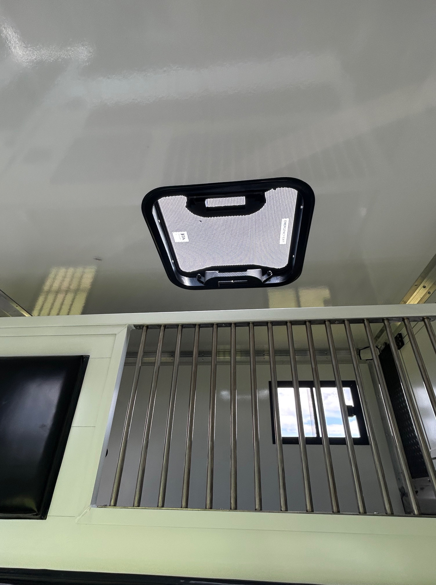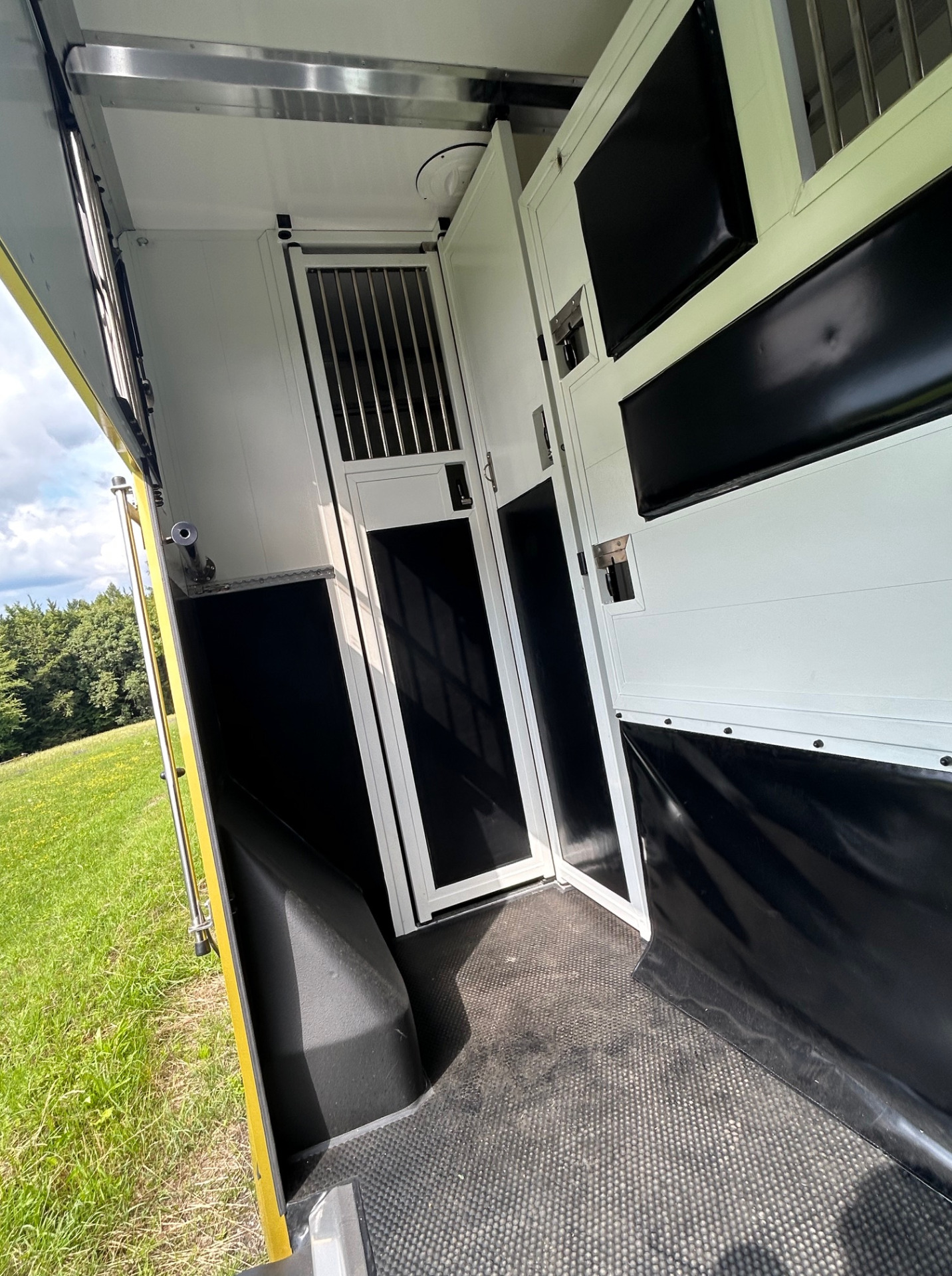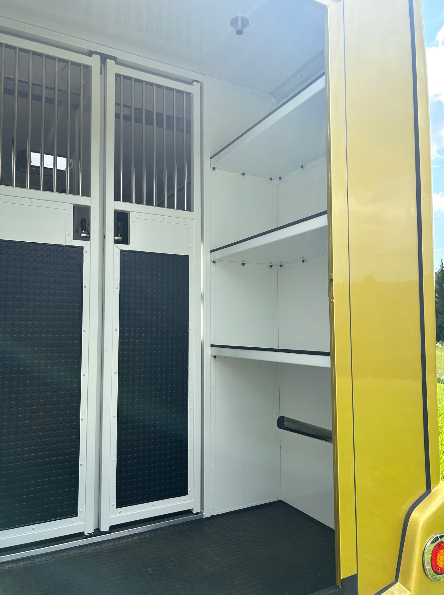 klimatizácia,predné hmlové svetlá,palubný počítač,Rádio – Bluetooth – USB tlačidlá na volante , zadný pohľad a kamera monitorujúca kone s displejom v kabíne.Protišmyková guma pod konmi,2x krúžky na siete na seno ,vetracie okno strešné,2 bočné okná,modré nočné svetlo v kabíne pre kone. Tento špičkový prepravník koní spája všetko, čo vy
